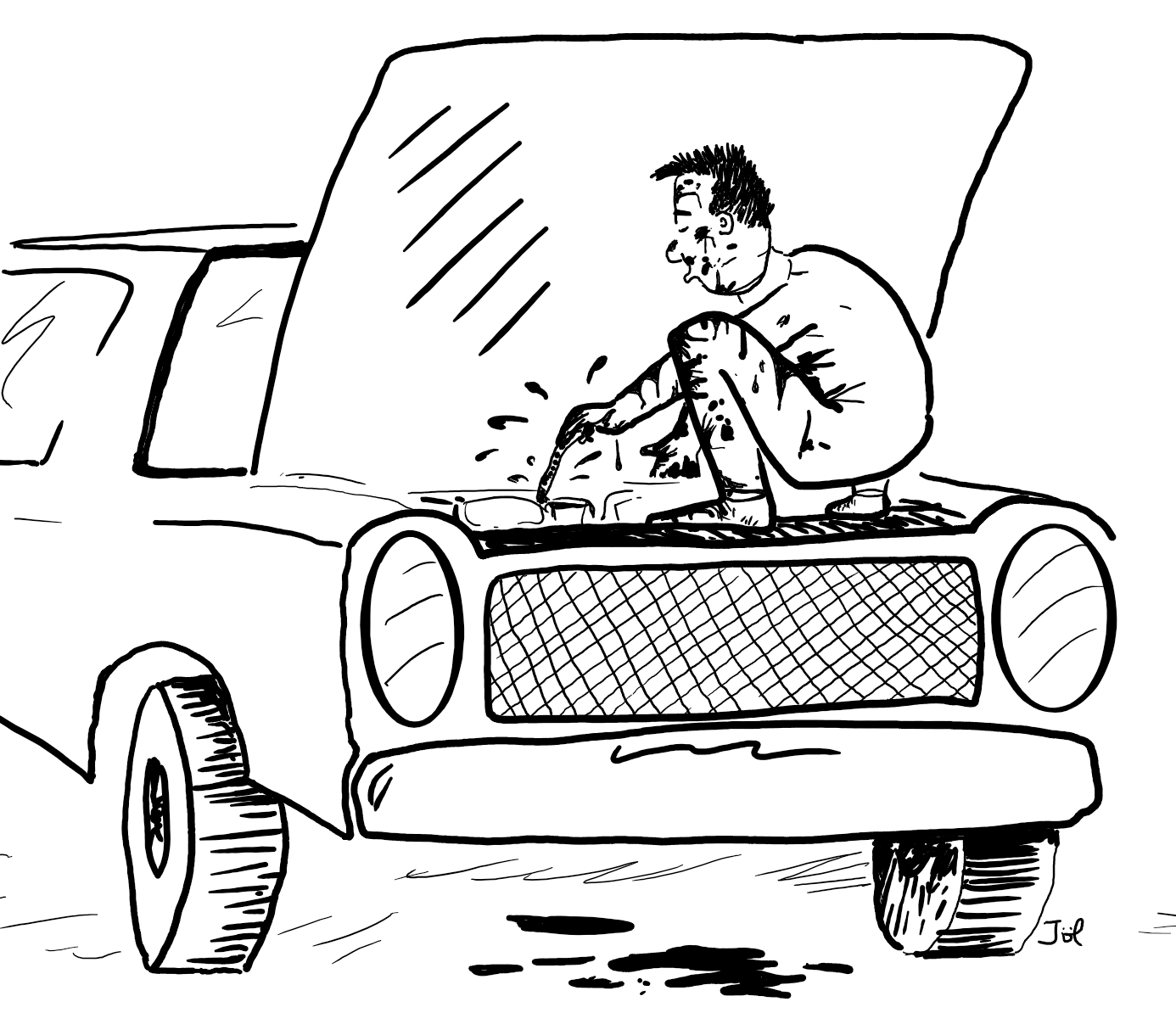 He’s no grease monkey except for the stains on his pants.